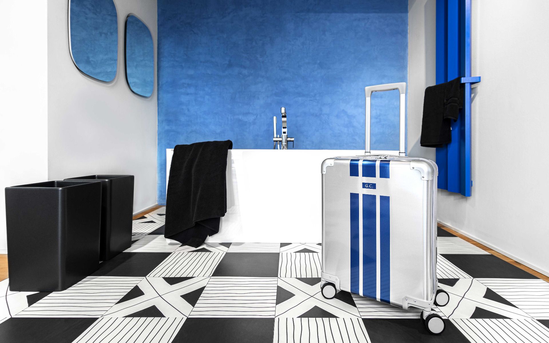 - La valigia Logo, dal gusto contemporaneo ed essenziale pensata per chi ama scritte e marchi in evidenza come elementi decorativi, realizzata volutamente con colori freddi e rigorosi a contrasto.